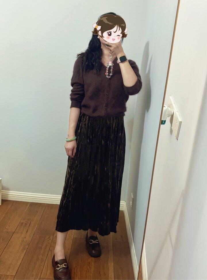 深棕毛绒开衫搭金丝绒百褶裙,同色系低调柔和,暖棕调裹满秋日松弛感,通勤日常都适配。
