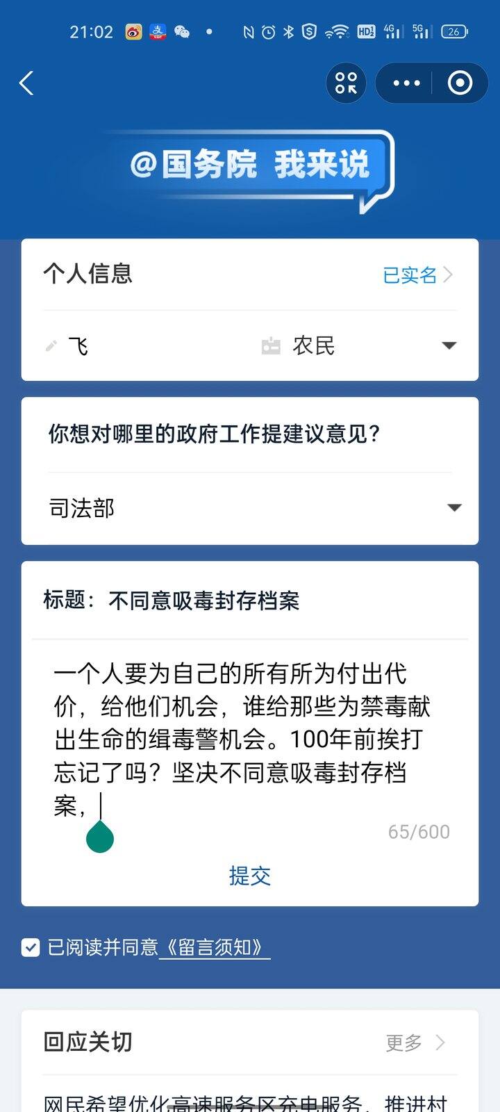 支付宝—市民中心—中国政府网留言—人民群众留言—司法部(地址选择那里点开,切换到国务院部门,选择司法部),我已经留言了,坚决不同意吸毒封存档案。