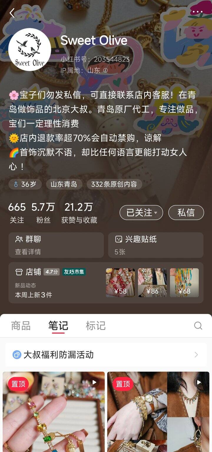 xhs一家卖项链手链耳环的店,店名在图二。基本是做出口单,所以款式会鲜艳或者浮夸一点,比较富贵~我最近买了条项链,在淘宝和pdd都没有搜到同款才下单的,不排除1688能找到类似风格的店铺。数量不多,有时候刷到首页推荐就已经抢完了,反正也不是每条都适合我,就欣赏一下积累审美。