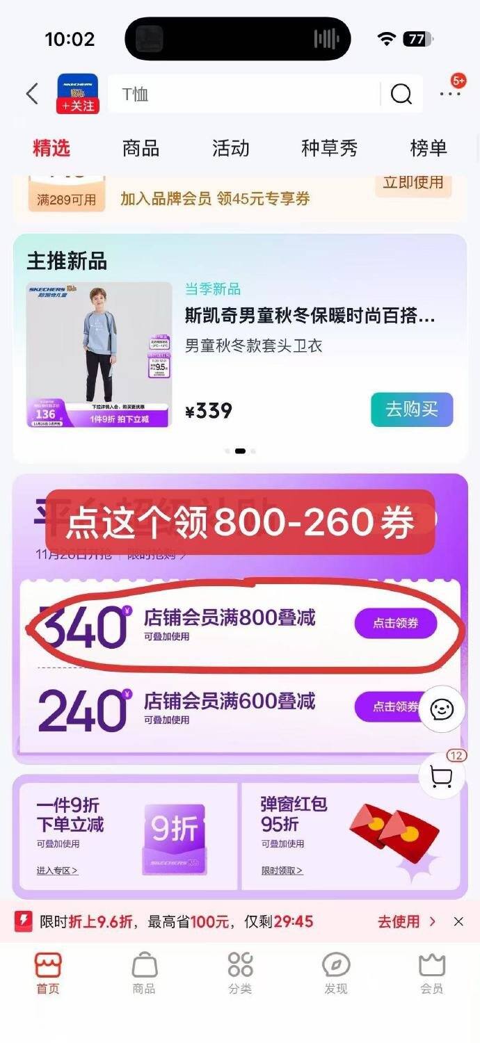 店铺入会页面有399-25券(会员券页面点击更多去找),店铺首页领取800-260券,部分号弹出限时9.6折红包