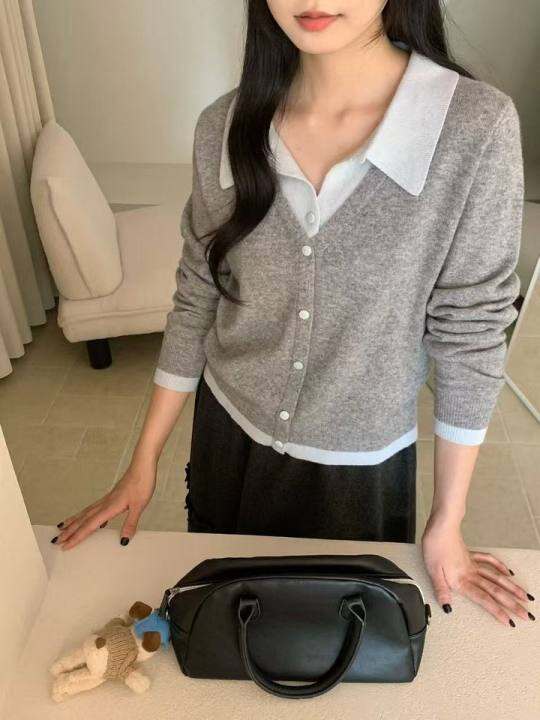 lilian~甜美温柔撞色翻领简约百搭秋季假两件毛针织开衫0182512