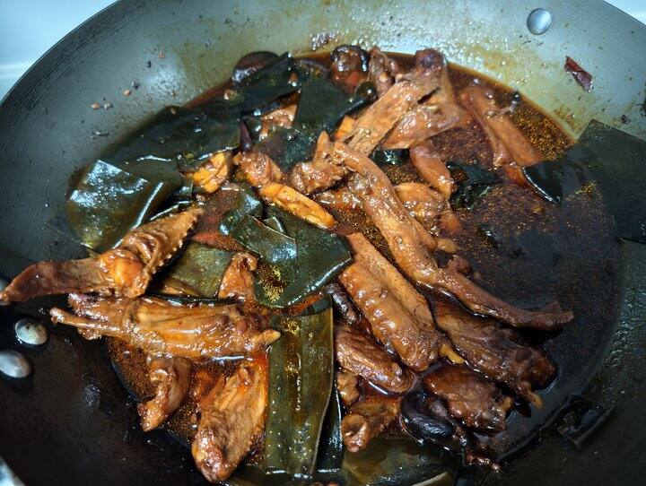 荤菜(基本上是鸭货)煮30分钟后,下海带、藕片、香菇等素菜,再煮10分钟。