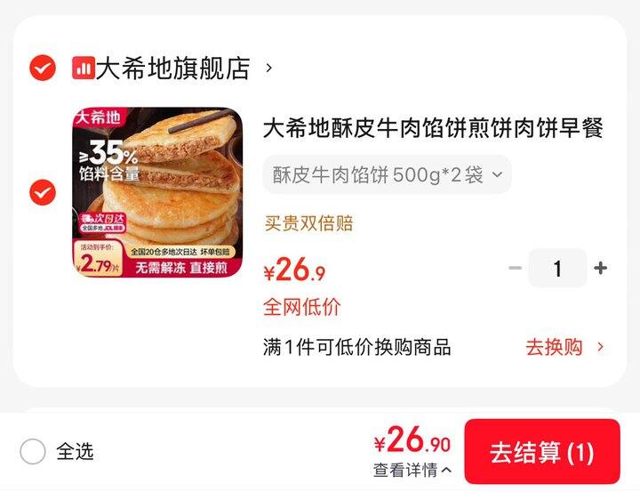 26.9💰 大希地 牛肉馅饼500g*2袋