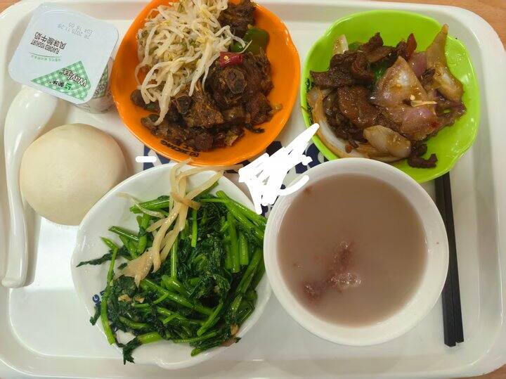 午:爆炒鸭块+洋葱炒肉柳+蒜香茼蒿+馒头+粥