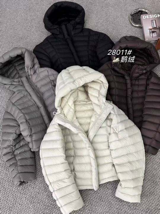 28011高端连帽90鹅绒服女2025冬欧袖三角贴标时尚保暖排骨羽绒服