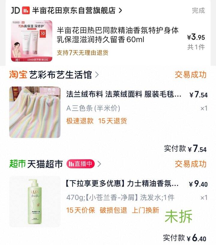 3.半亩花田 身体乳:味道还可以,一开始肤感是浮在表面,后面慢慢吸收了就还好,滋润度一般吧。4.法兰绒布料:买了块布给小猫当垫子毯子,挺柔软的。看评论区好多人买布料自己做衣服甚至还有棉拖,真厉害。