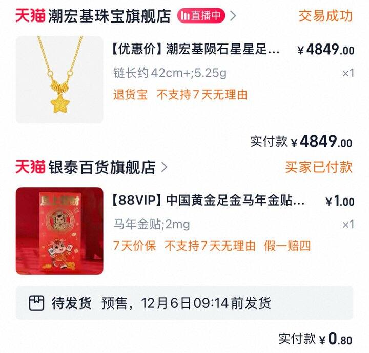 7.潮宏基 陨石星星项链:在金饰收税之前买的,叠完买下来克价在902左右。很好看。8.中国黄金 马年金贴:88积分兑换的,其实款式看起来感觉一般,但不知道换啥,随便换个玩玩。还没发货。