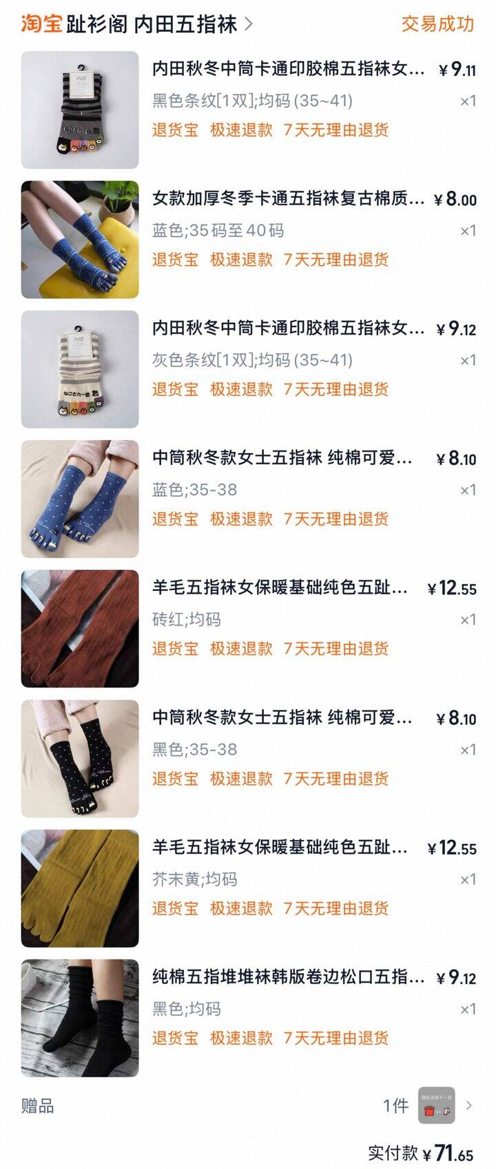4.内田 五指袜:这家店是在路口搜到的,买了2双羊毛的,剩下都是纯棉的,还送了一双短款的(送的这双挺丑的,会掉跟[鹿笑哭])。目前穿了几次,质感还不错。店里还有个美利奴羊毛的更贵一些,没舍得,下次有去北方再试试这种材质吧。买五指袜是因为刷到一篇帖子《脚冷又爱出汗的怎么办》,评论里提到穿五指袜或者羊毛袜能缓解。买的羊毛五指袜还没试,普通纯棉五指袜感觉是有效果,可能是因为把脚指头隔开了通风一点,加上每个指头间多了布料增强了吸汗量吧。