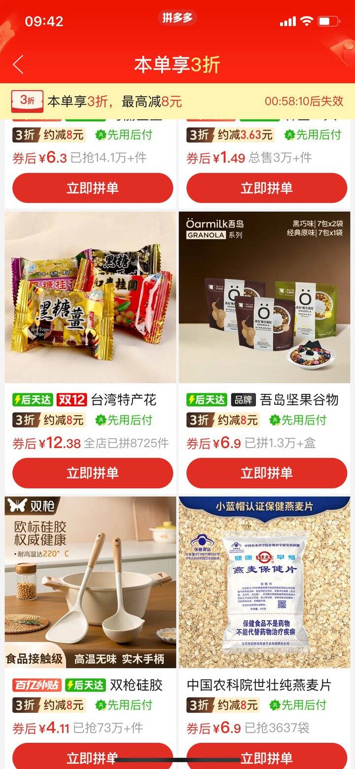 拼多多推荐这个,打开拼多多给你推荐这个活动可以参加一下,都是平时收藏感兴趣的,第三单的三折也有低价产品,其他的三单活动第三单都是很贵的单价产品,最高减8元一点没用,没有这个好用。