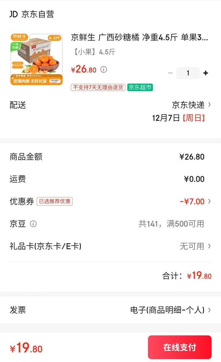 京鲜生 广西砂糖橘💰4.4/斤
