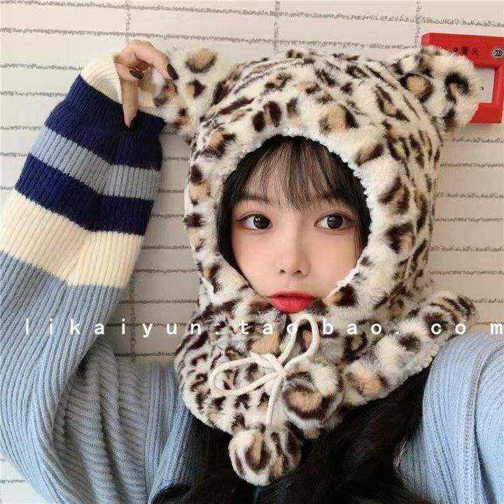 小熊护耳朵帽子女秋冬季可爱冬天毛绒围巾连帽一体韩版百搭保暖潮