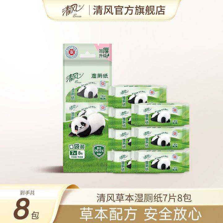 清风草本湿卫生纸7片8包可携式超迷你清洁屁屁清爽如水洗亲肤