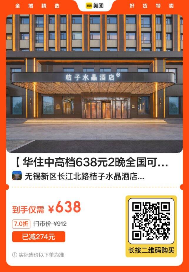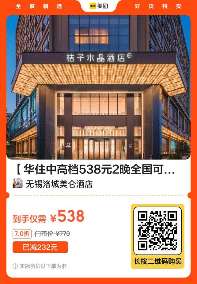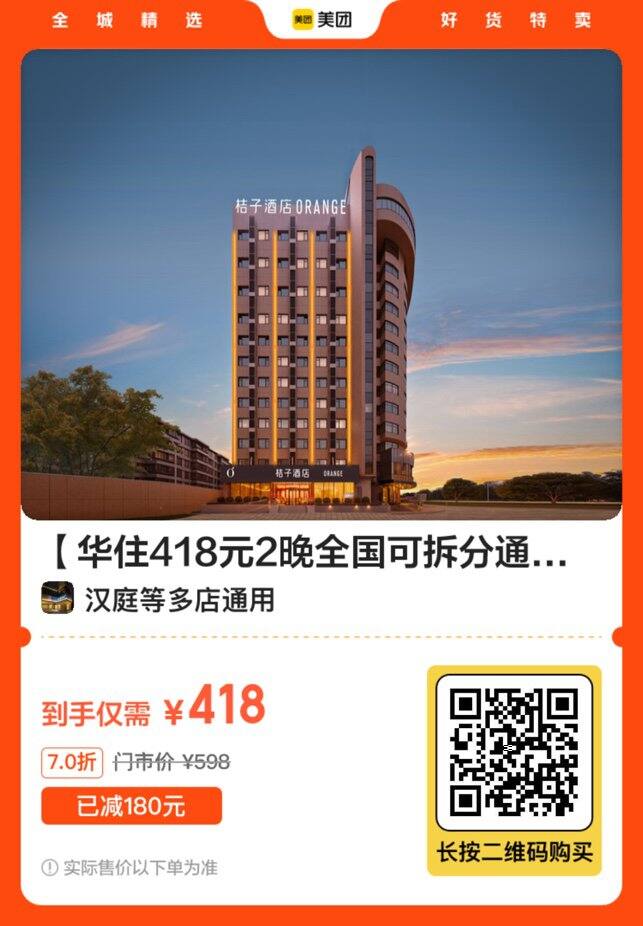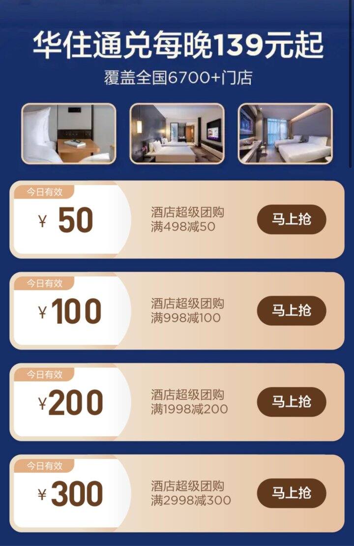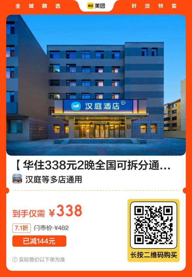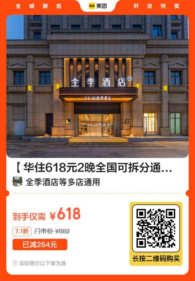 华住468元2晚全国可拆分通兑,全季、桔子、汉庭等品牌适用