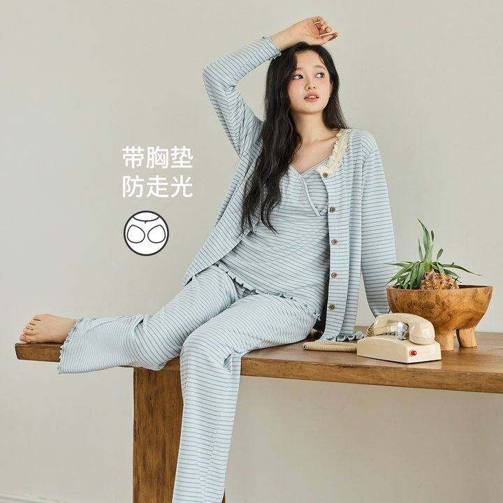 珈莹艾带胸垫月子服三件套秋冬产后德绒哺乳睡衣春秋孕妇家居服