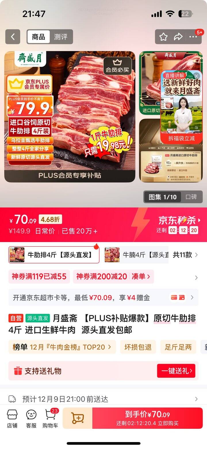 月盛斋 进口谷饲原切牛肋排4斤,Plus拍1件💰70.09