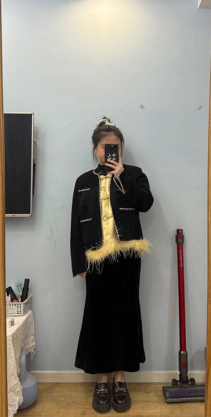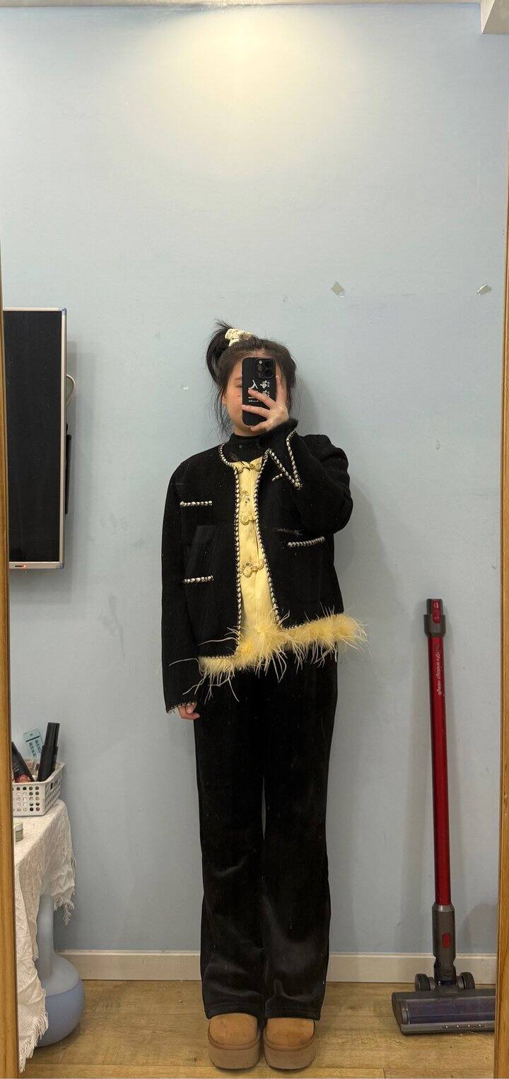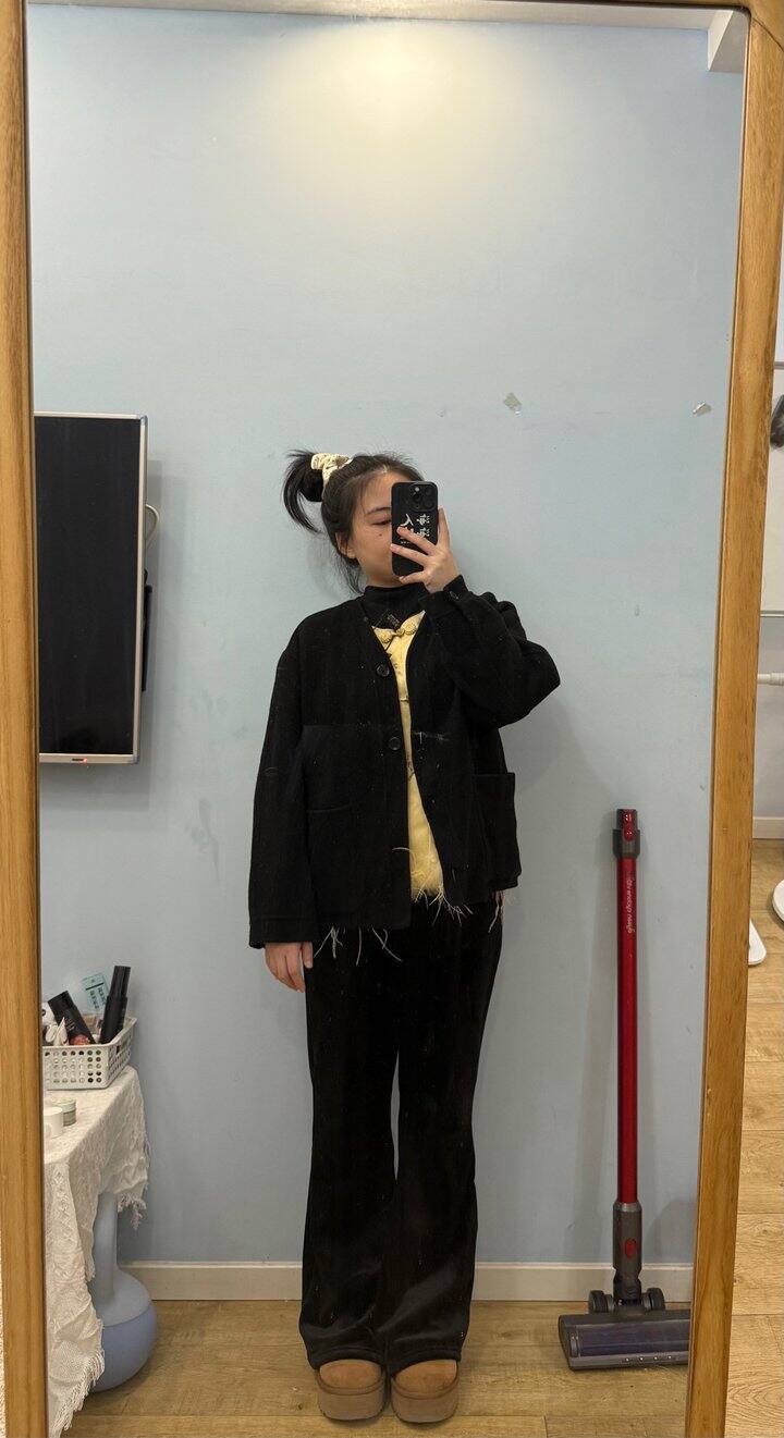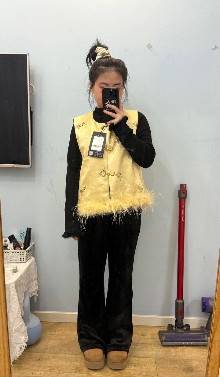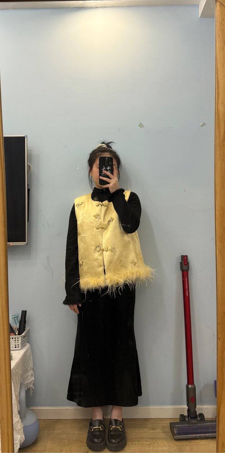 颜色上:感觉这种亮色的黄跟黑色比较搭,又因为有点大,很多大衣穿上感觉马甲被挤到前面去了,搭配清薄点大衣会更好点,不会显得臃肿。小个子要是搭配短外套应该会显高点。