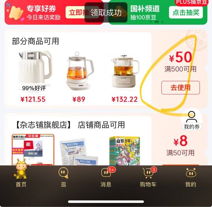 概率弹50券或者去领券中心领取