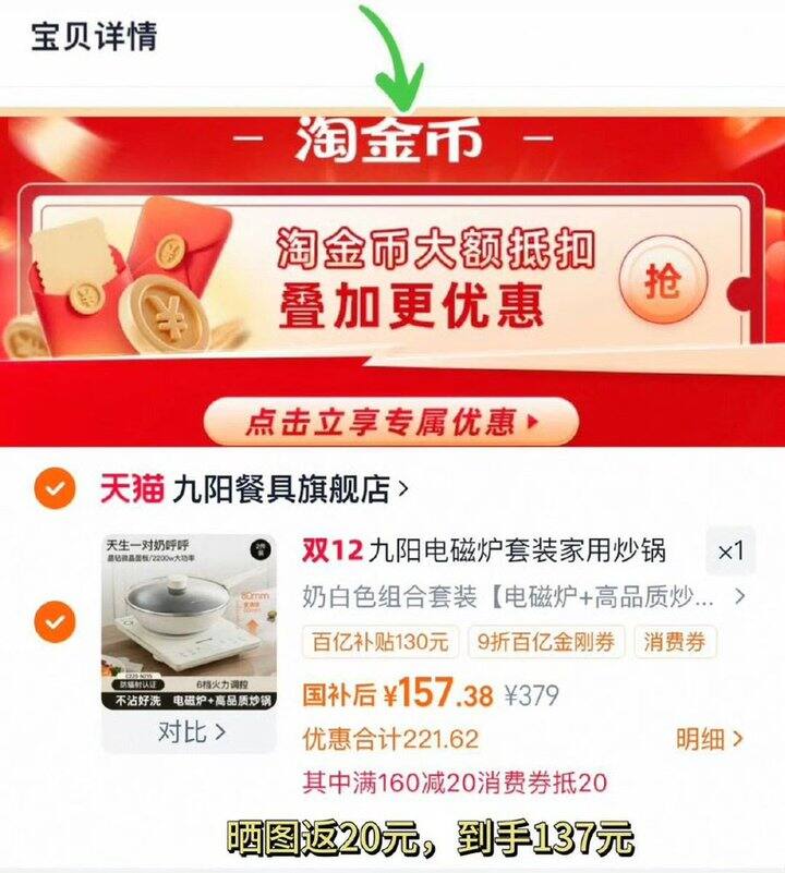 下拉拍第一项+用金刚券💰157返20亓=137【九阳】电磁炉+炒锅2件装https://m.tb.cn/h.71ep7lq