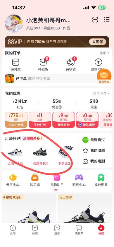 以下攻略到手💰14元,觉得麻烦的忽略,24也很划算的!需要点淘app,下载部分用户弹5元红包🧧,然后元宝中心可以兑换香菇来了直播间3🧧,从足迹加购部分有补贴,鞋子到手低于14块钱,