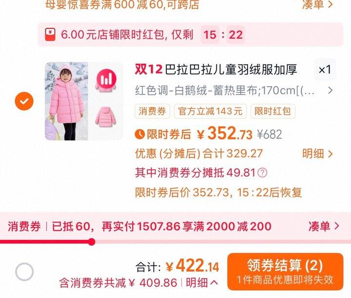 ❸巴拉巴拉儿童鹅绒加厚中长款羽绒服