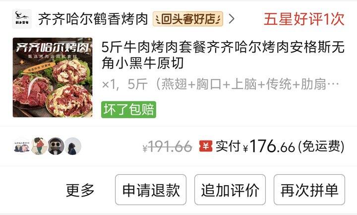 这家是pdd无意间刷到的,看评论很好,上次和朋友聚餐就买来试试,没想到品质也很好,而且这个价格有五斤啊!!!才三十多一斤。这个是一斤一包的,量很足。不过传统不管哪一家都挺瘦的,我个人偏爱肥瘦相间,嘿嘿。
