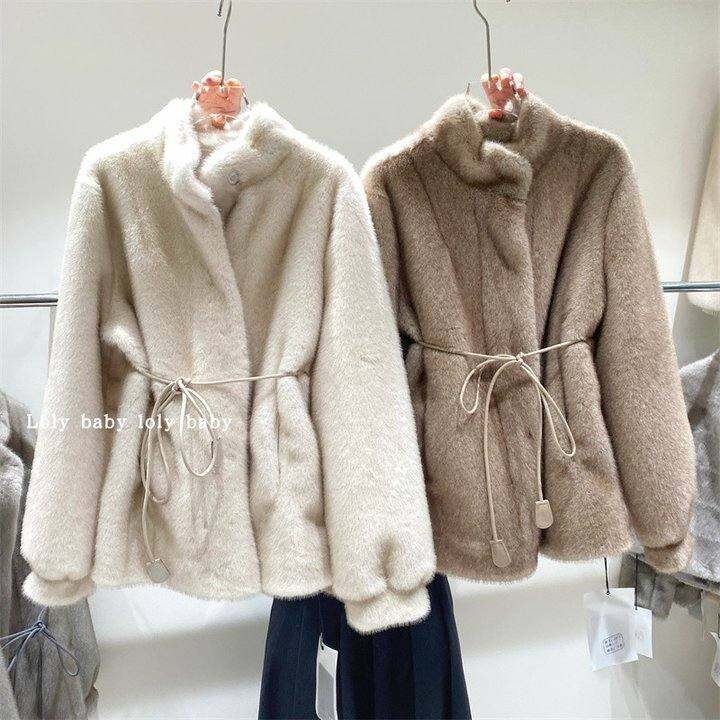 韩版立领水貂毛皮毛一体外套女中长款2024新款毛绒环保皮草大衣冬
