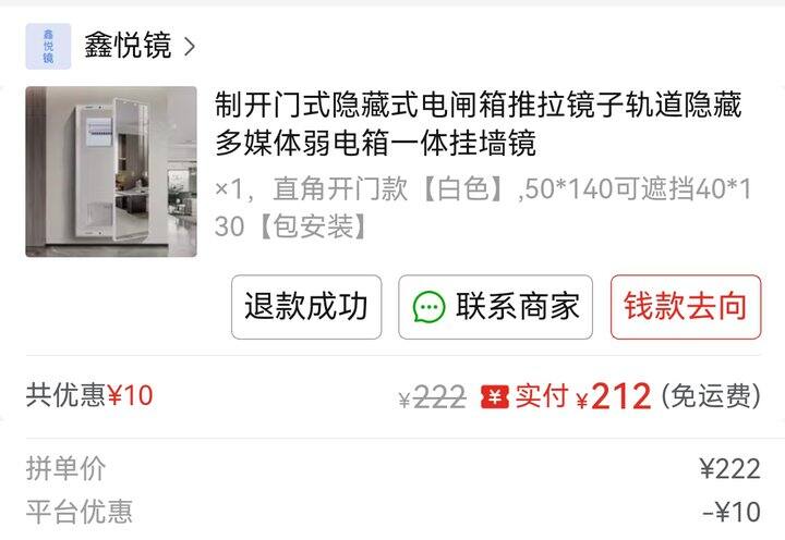 1.镜柜:自己安装,还退了20元安装费,实付192元。