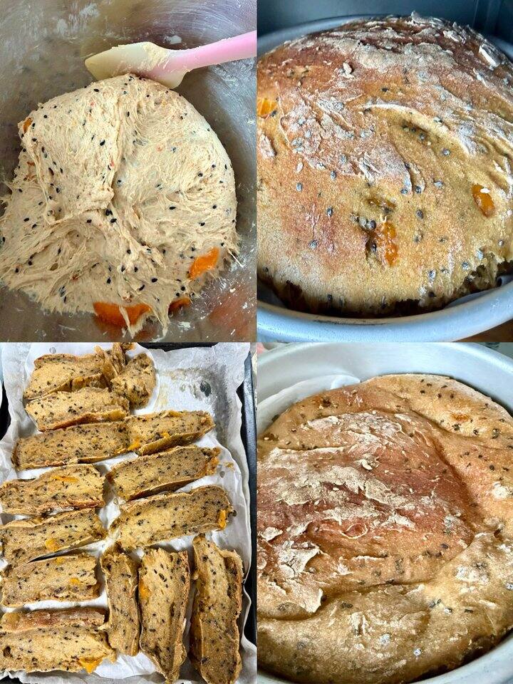 本来是做面包的,水加少了,结果烤完冷却后都塌了,面包变成了糕,里面还很黏糊,于是切片烤了两遍,把两面都烤干一点,味道还可以吧