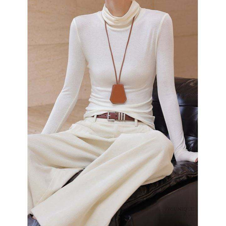 JWUNIQUE酒窝 基础百搭 莱赛尔天丝舒适堆堆领长袖T恤内搭打底衫