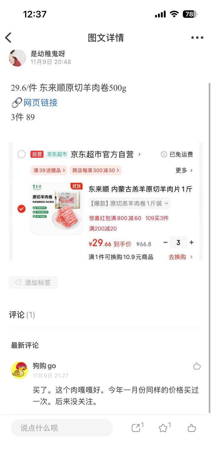 东来顺 内蒙古羔羊原切羊肉片1斤装,拍3件99 这家反馈不错
