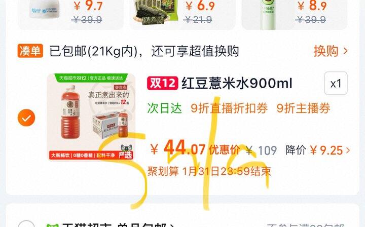 返回购物车,数量改1,到手44