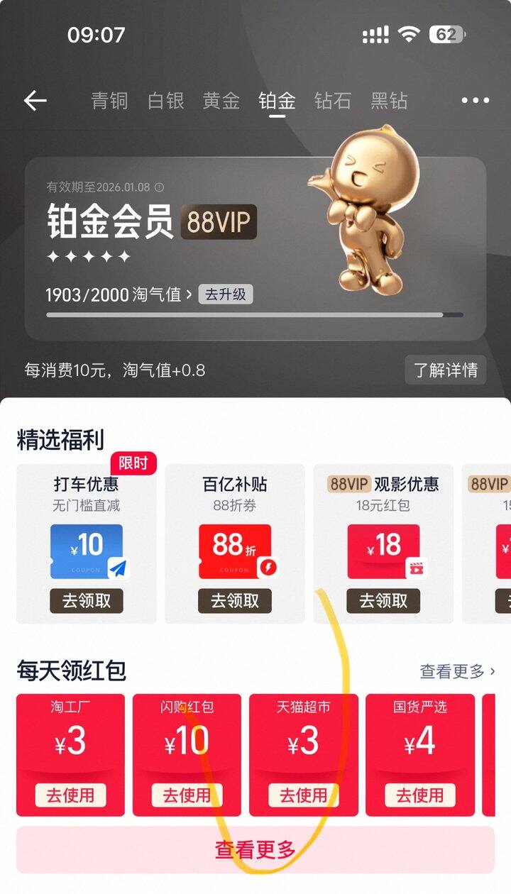 15-3猫超补贴红包(淘宝-我的-会员中心-每天领红包)