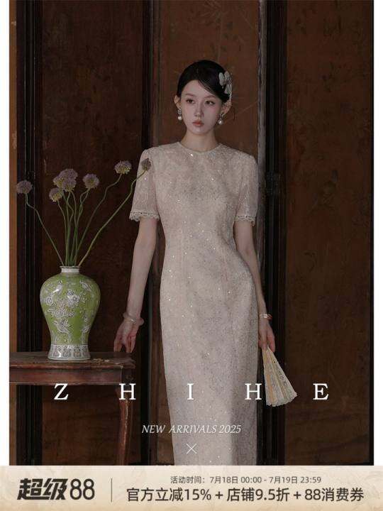 无艳一禾【绯云香】静奢雅致重工珠片蕾丝珍珠领收腰连衣裙