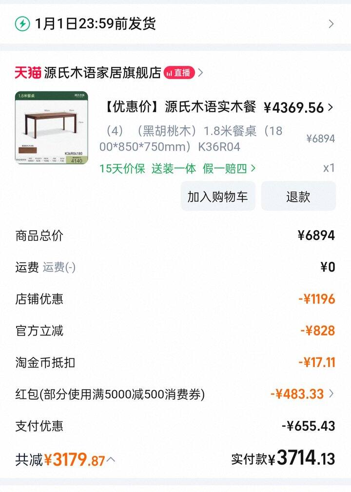 3700的黑胡桃1.8米的餐桌,还要什么自行车。我之前蹲源氏木语白蜡木2米餐桌都要3100。