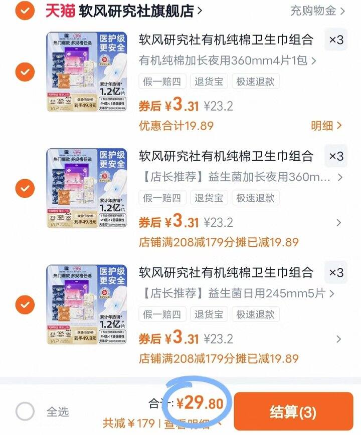 软风研究社卫生巾29/9件,3元一包https://s.click.taobao.com/0PQMVuo; 软风研究社拍4件到手8包 https://s.click.taobao.com/E71oUuo;