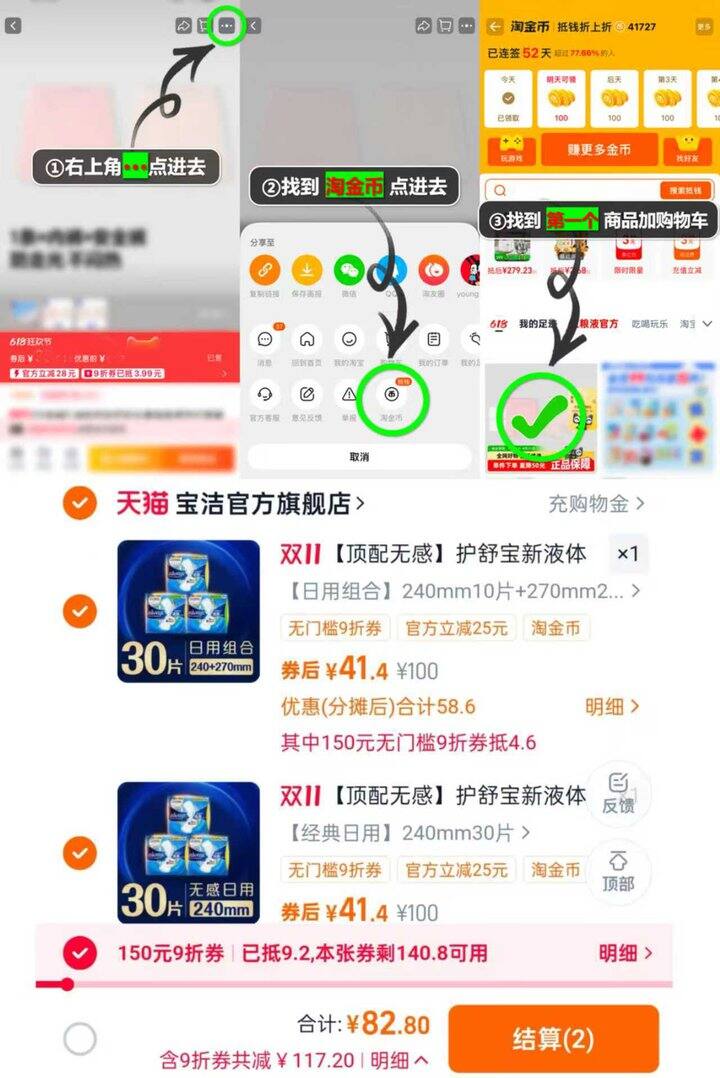 护舒宝新液体卫生巾拍2份https://s.click.taobao.com/ia6eUuo,限时补贴6.8元+淘金币6元,2件到手92.2元,消费券88折后81.14元,平均1.35元/片】