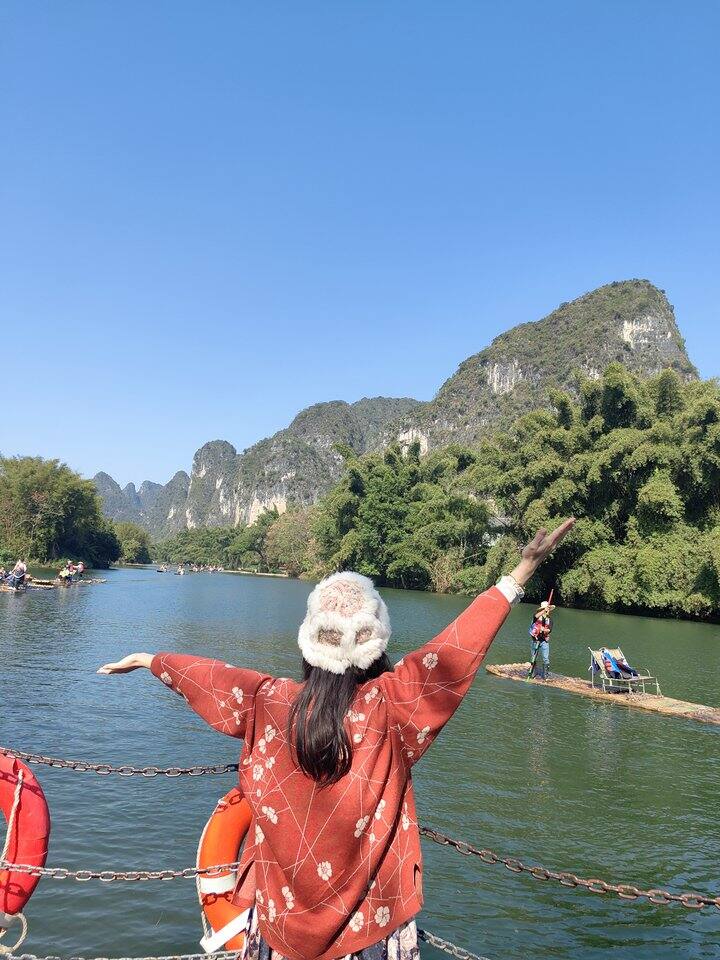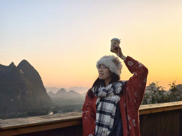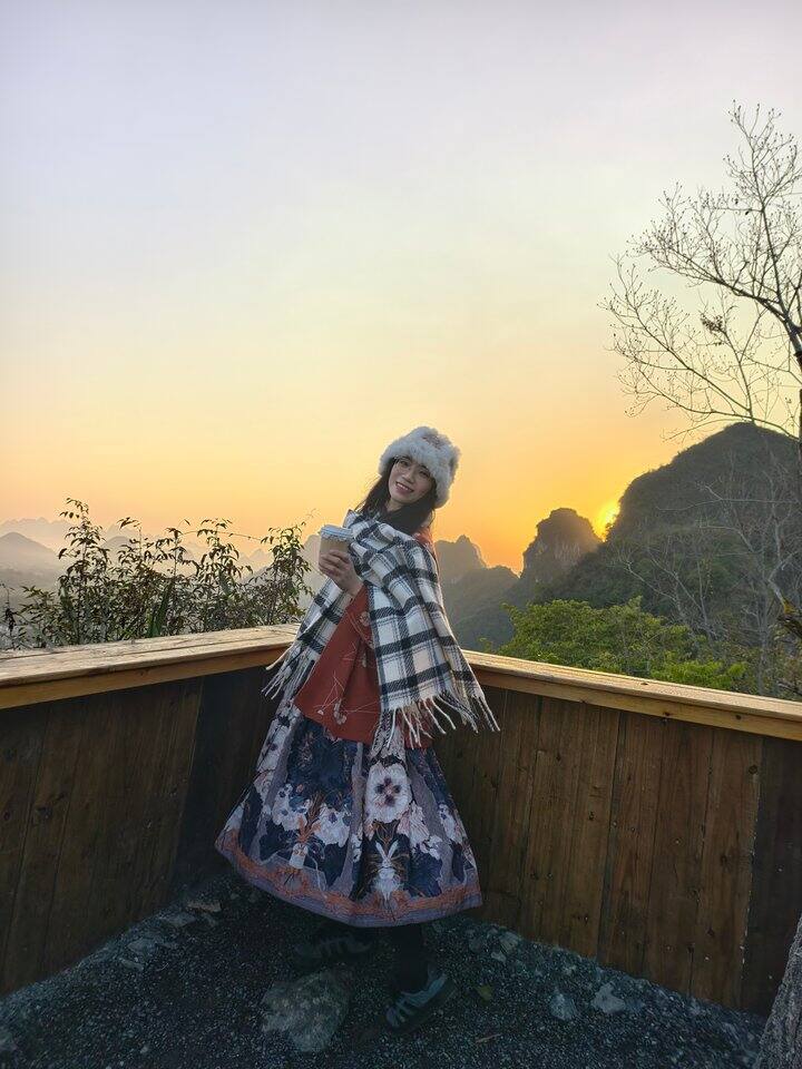 茱萸的红色飞机袖我还是买啦!页面说30天内发货,实际上差不多半个月就收到了,非常之美貌的一件开衫,正好突然有去桂林的行程,穿着它跋山涉水看日出坐游轮,既出片又保暖(当然保暖是相对的它一个含毛量30%的开衫也暖不到哪里去,主要还是靠冲锋衣保暖)。最搞笑的是山顶上我帽子围巾飞机袖甚至我的咖啡都被别人薅去当拍照道具了剩一个光秃秃的我[哭笑]
