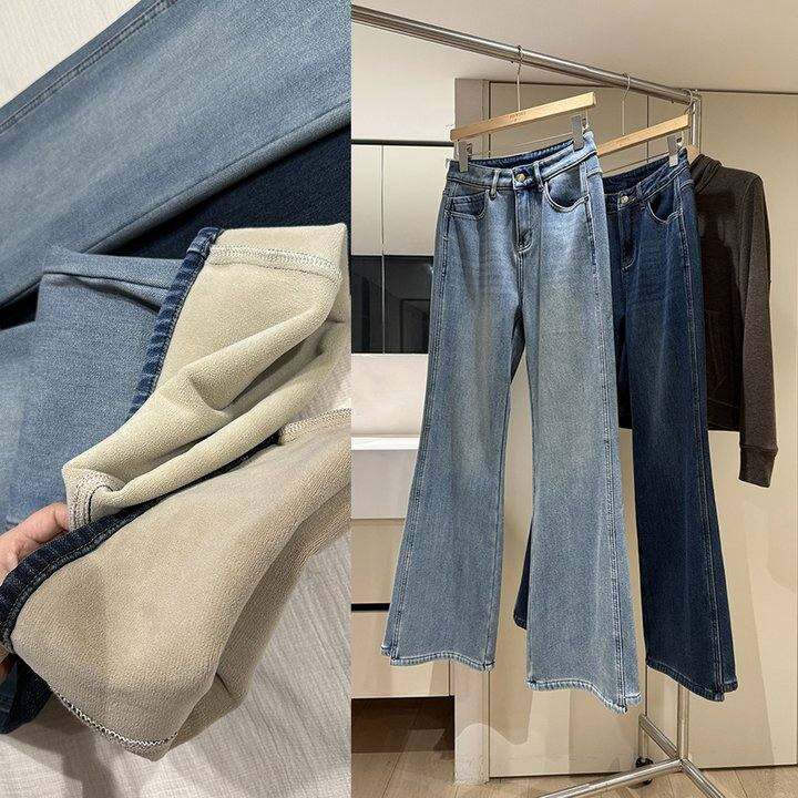 前长后短 一条过冬厚绒加厚厚实保暖高腰筒喇微弹喇叭牛仔裤长裤