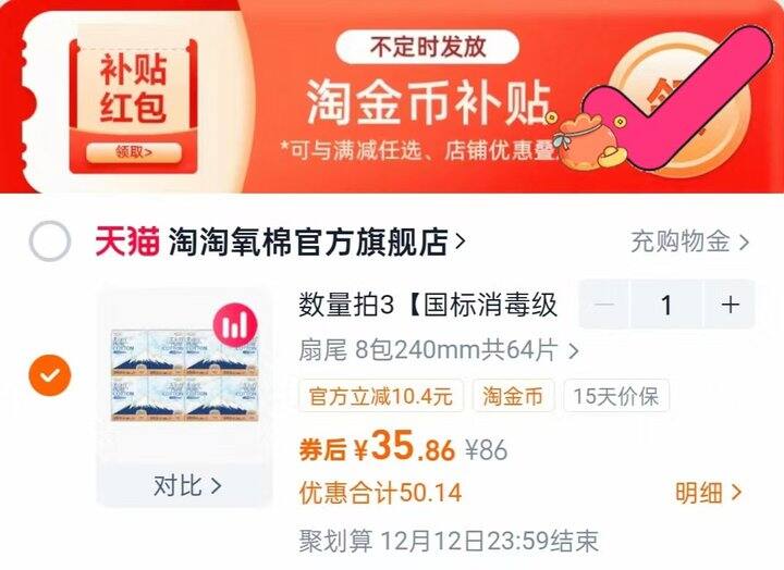 淘淘氧棉日夜卫生巾先下拉领红包不拍