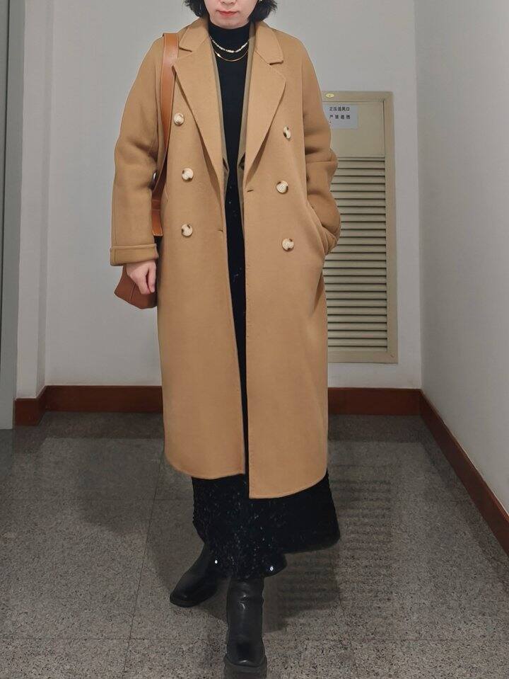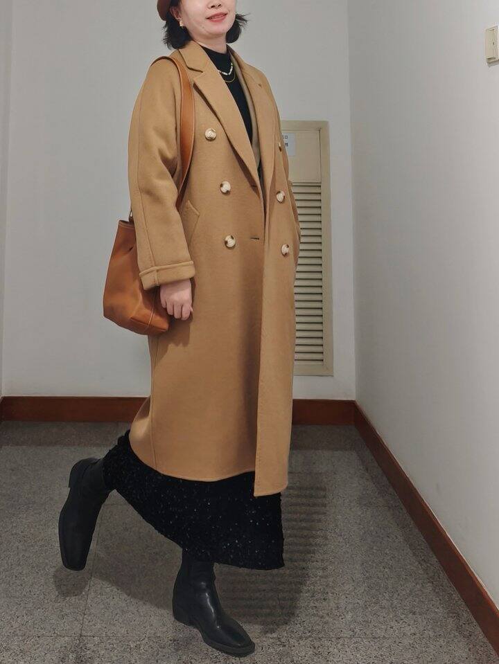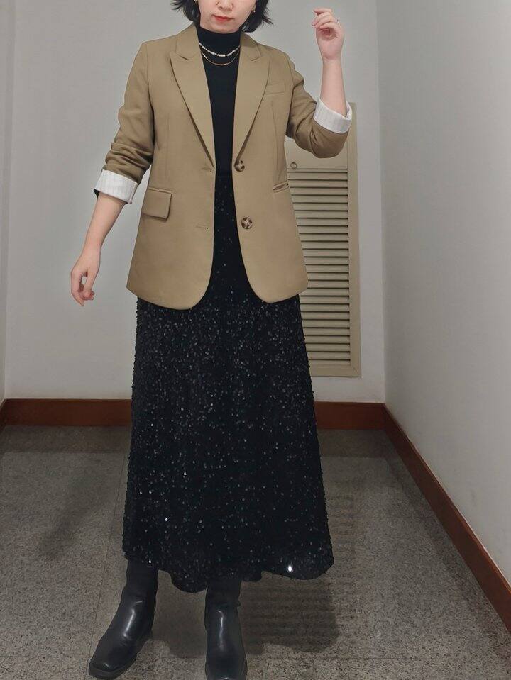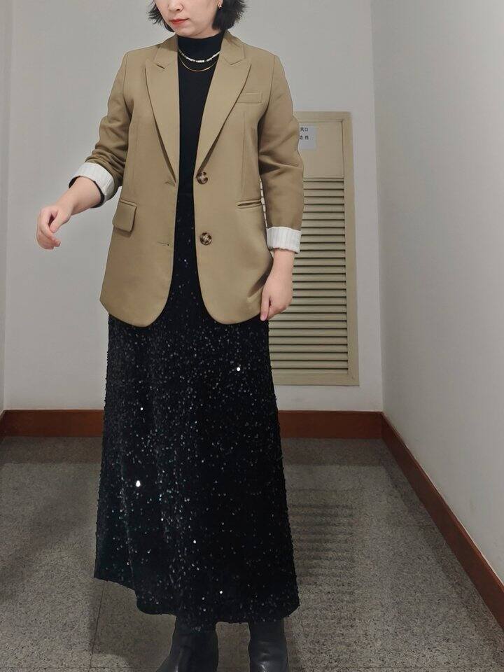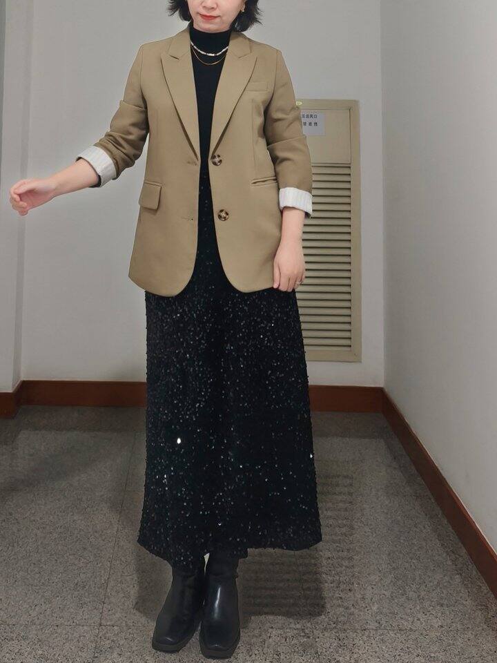 内搭一身黑,但有亮片半裙和项链点缀,不会太沉闷