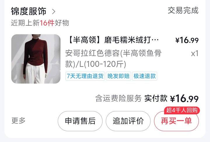 打底挺不错的,17块钱还包运费险要啥自行车…我反正是挑不出啥毛病,里面没套衣服。贴身穿了亲肤还很保暖。