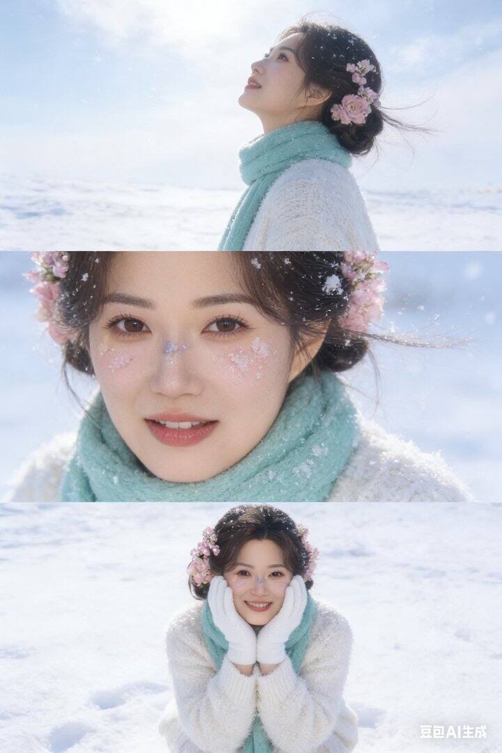 下宫格:近景镜头,女孩在雪地里,双手戴着白色手套捧着脸颊,对着镜头露出甜美羞涩的微笑