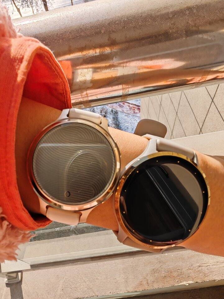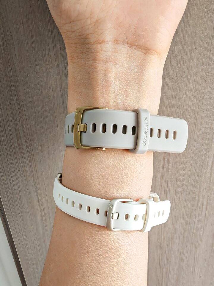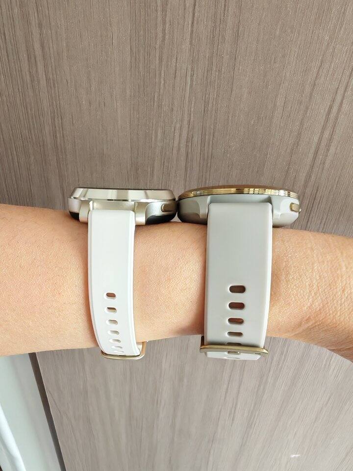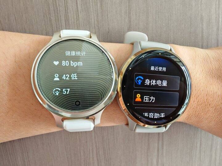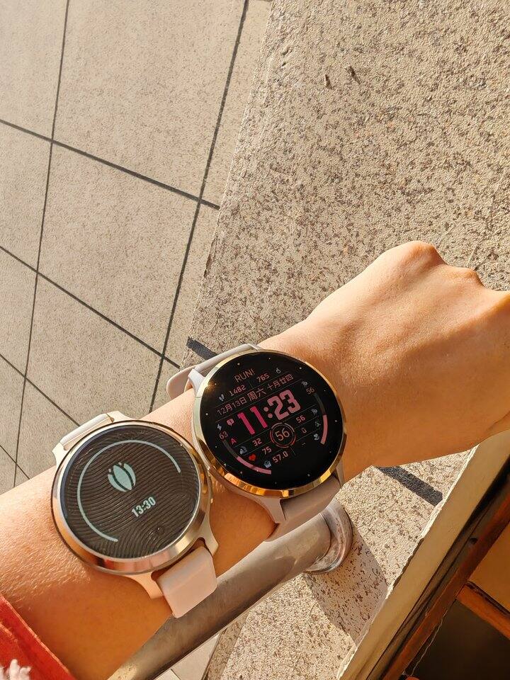左Lily 2 active,右venu3sLily是比较女性化的,表盘小38mm?,重量比venu轻,但是似乎不能换表盘,无法连接connect IQ,这点可能让很多人不爽,毕竟换表盘是很大的乐趣!哈哈哈!
