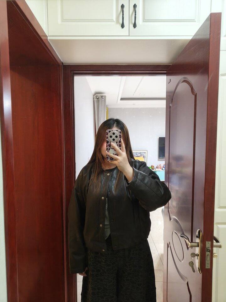 比较宽大的版型穿起来倒是还不错,皮质软软的,问题就是这种短款型的不怎么显瘦,好纠结留不留