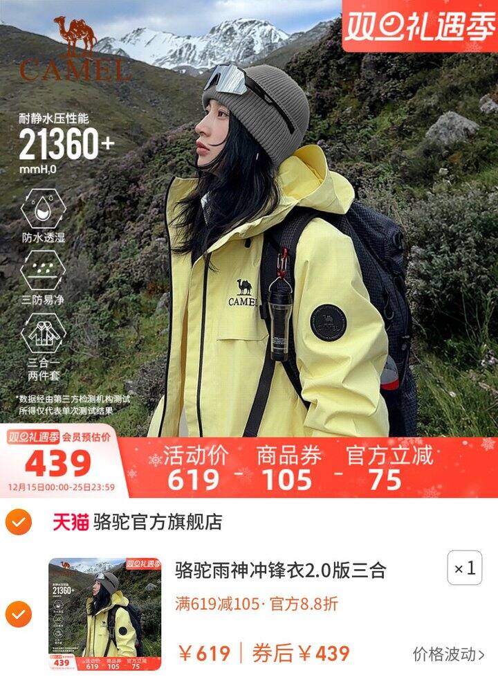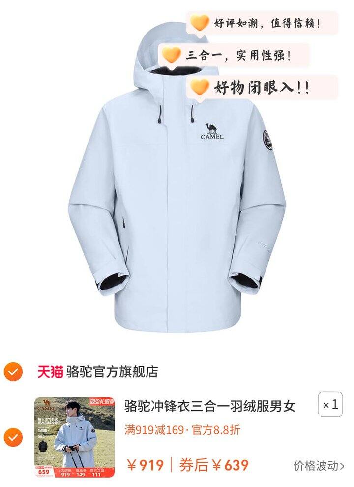 1、骆驼冲锋衣三合一羽绒服男女冬季新款羽绒内胆外套防风防水登山服https://m.tb.cn/h.7WMeCkV弹115礼金,淘金币页面加购抵扣25