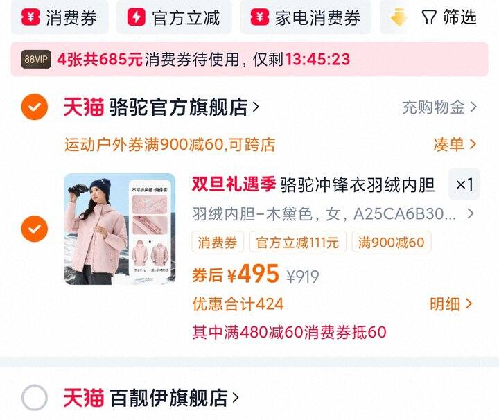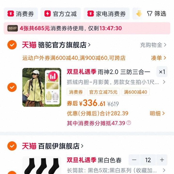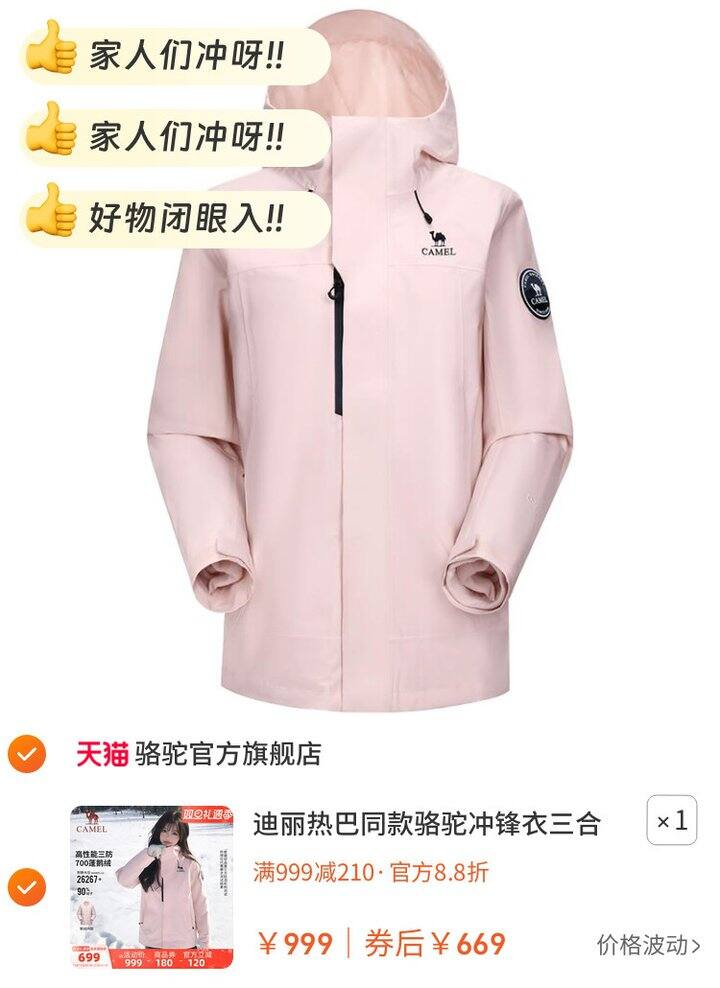 1、迪丽热巴同款骆驼冲锋衣三合一鹅绒羽绒服女户外王者凯甲ICON外套https://m.tb.cn/h.7WWiJV4弹120礼金,淘金币页面加购抵扣25