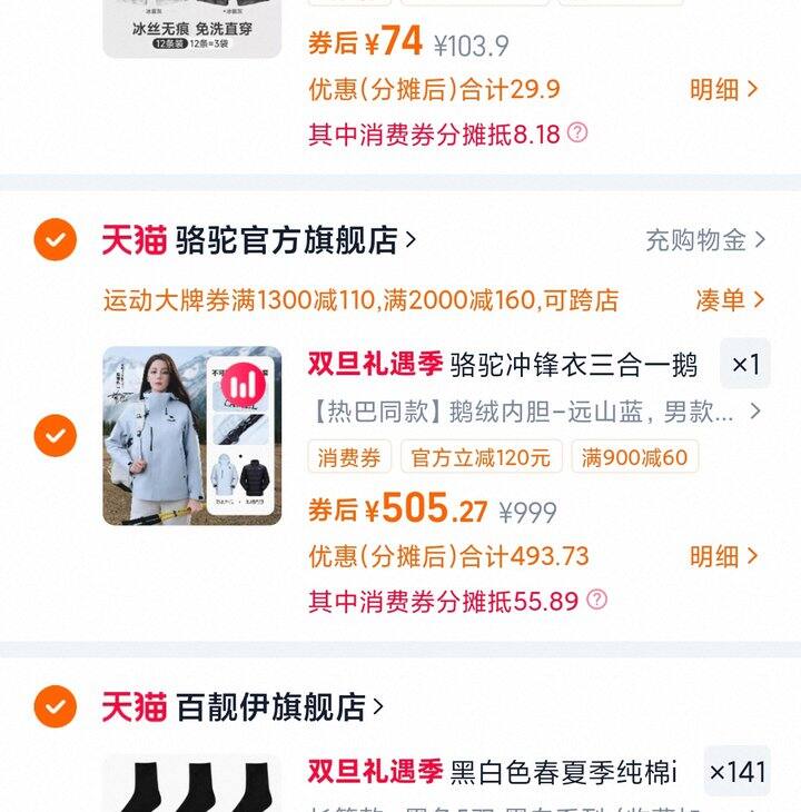 1、骆驼雨神冲锋衣2.0版:https://m.tb.cn/h.7WDiy5m弹79礼金,淘金币页面加购抵扣15
