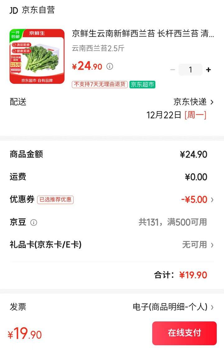 19.9💰京鲜生 云南新鲜西兰苔2.5斤