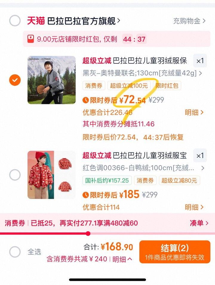 巴拉巴拉儿童轻薄羽绒服丨72.54