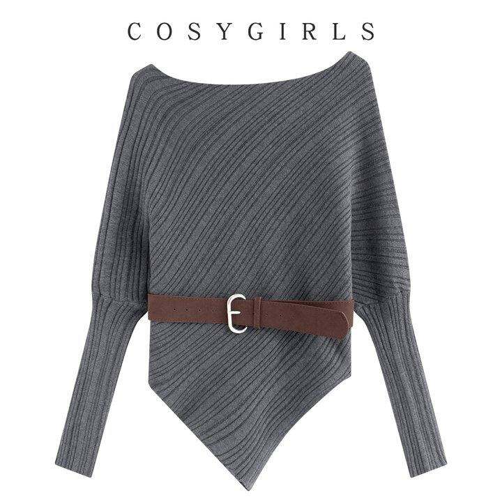 套头毛衣女独特别致不规则上衣秋季新款法式复古斜肩长袖针织衫潮
